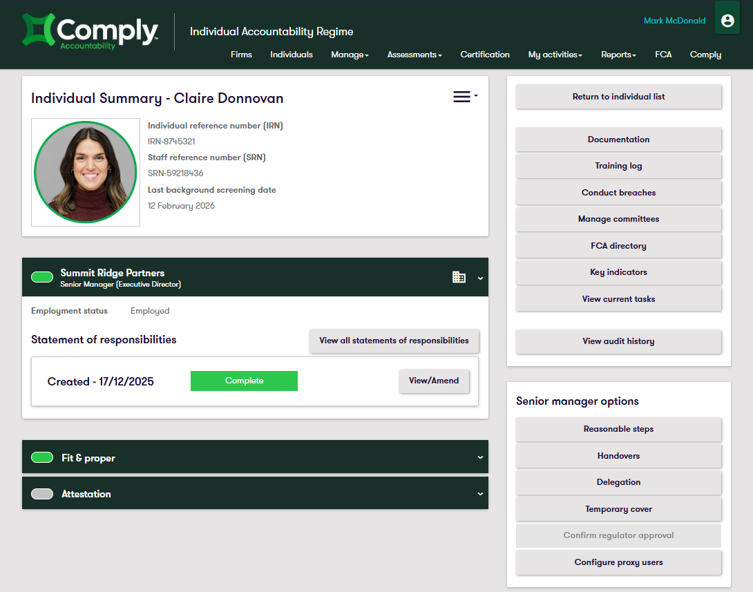 Comply Accountability is available today as a standalone solution and is being progressively integrated into the broader Comply platform. In the first phase, users access Comply Accountability through single sign-on (SSO) alongside their existing Comply tools. In the next phase, accountability data will be surfaced directly within the Comply employee profile — giving compliance teams a single view of an individual’s obligations, accountability records, and compliance activity in one place. For firms already using Comply, this means your SMCR and accountability obligations will sit alongside your existing employee compliance program without the need for separate logins or manual data reconciliation.