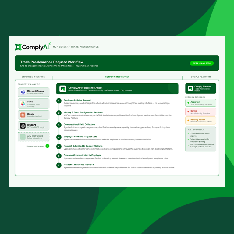“The future of compliance is agentic intelligence that works inside the tools you already use. Some vendors call themselves AI-native. What they mean is they started with AI,” said David Bliss, Chief Product Officer at Comply. “What they do not have is the underlying data infrastructure — the regulatory depth, the broker connectivity, and the decades of experience that makes agentic outputs defensible. The difference is that with access to Comply MCP, a compliance professional can submit a trade pre-clearance request in Claude, Teams, or Slack from their phone, with full confidence the agentic workflow is governed by their firm’s compliance policies. You cannot get there by starting with AI. You have to earn it.”