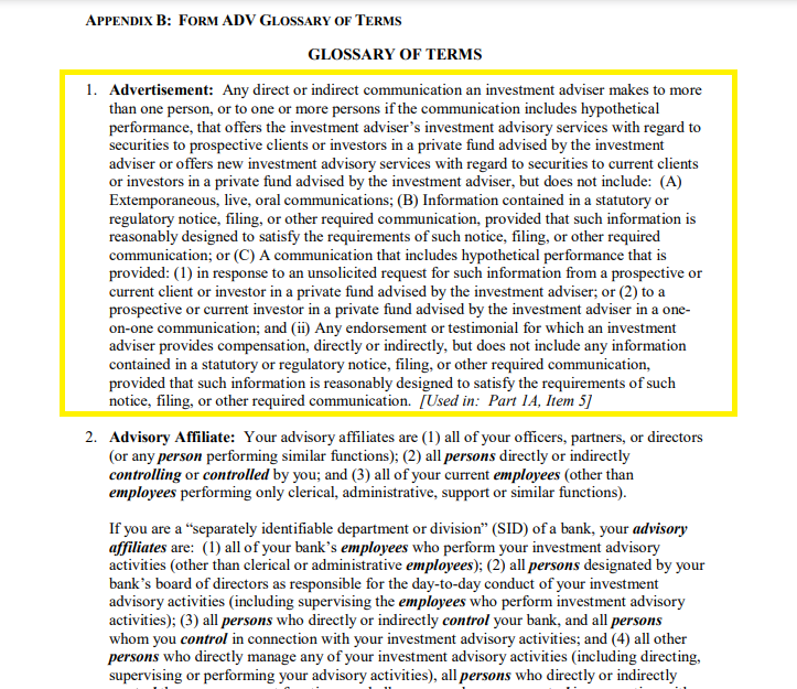 The updated definition of an Advertisement can be found in the updated Form ADV Glossary of Terms: