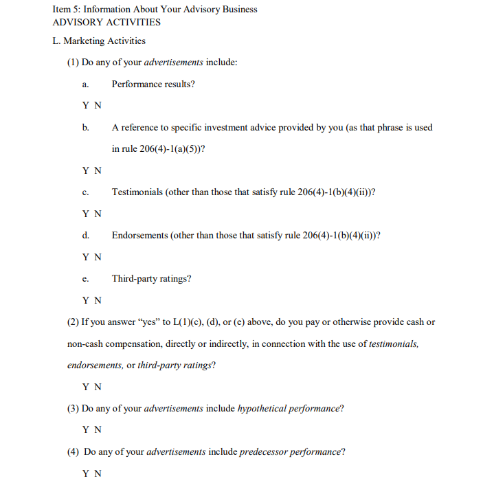 Item 5 of Form ADV Part 1A has been updated to include a new section L. RIA firms will need to disclose if they advertise performance results, use testimonials, use endorsements, or third-party ratings: