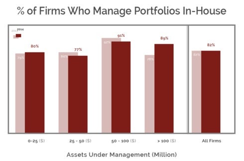 The chart below indicates the percentage of investment advisory firms in 2014 compared to 2013 that manage portfolios internally or “in-house” across different assets under management (AUM) segments: